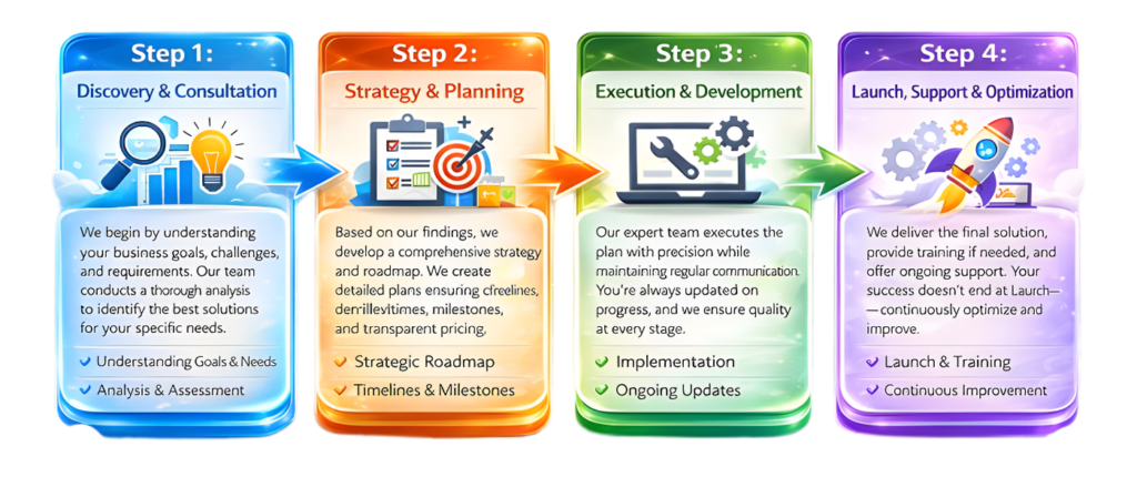 Whether it’s implementing digital solutions, building custom applications, or maintaining your online presence, we make sure your digital journey is seamless, scalable, and future-ready.